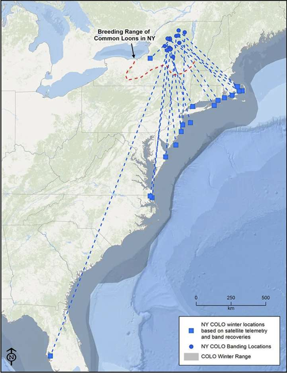 The Adirondack Center for Loon Conservation and its collaborators have used a variety of techniques, including banding, geolocators, and satellite telemetry, to learn more about the migratory pathways of Adirondack Loons. Although many questions remain unanswered, these new advances in technology help us get a better understanding of loon travel routes and patterns. Our satellite telemetry study showed that adult loons migrated from the Park to the Atlantic coast in less than a day. Band returns and sightings from Adirondack loons also indicates that the birds have traveled as far south as the coast of North Carolina and the Gulf coast of Florida.
